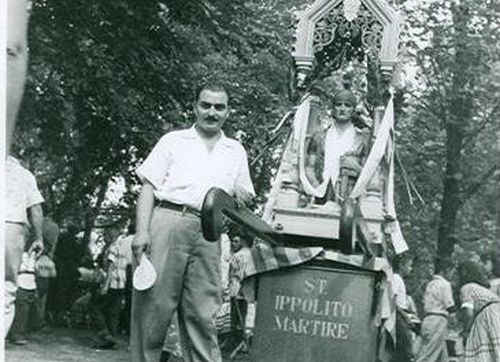 Family members participating in the tradition of pinning money on the Sant’ Ippolito statue.