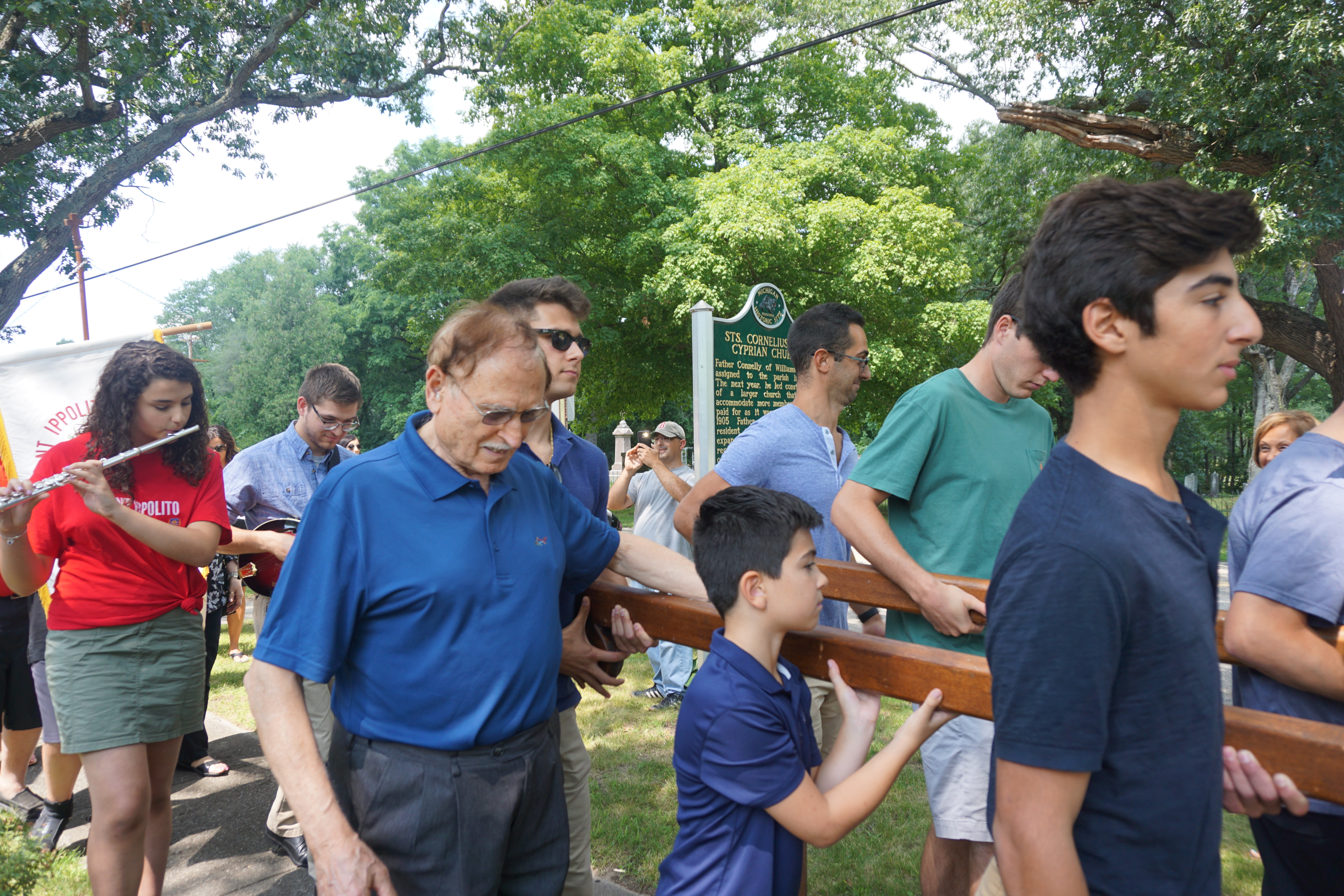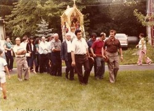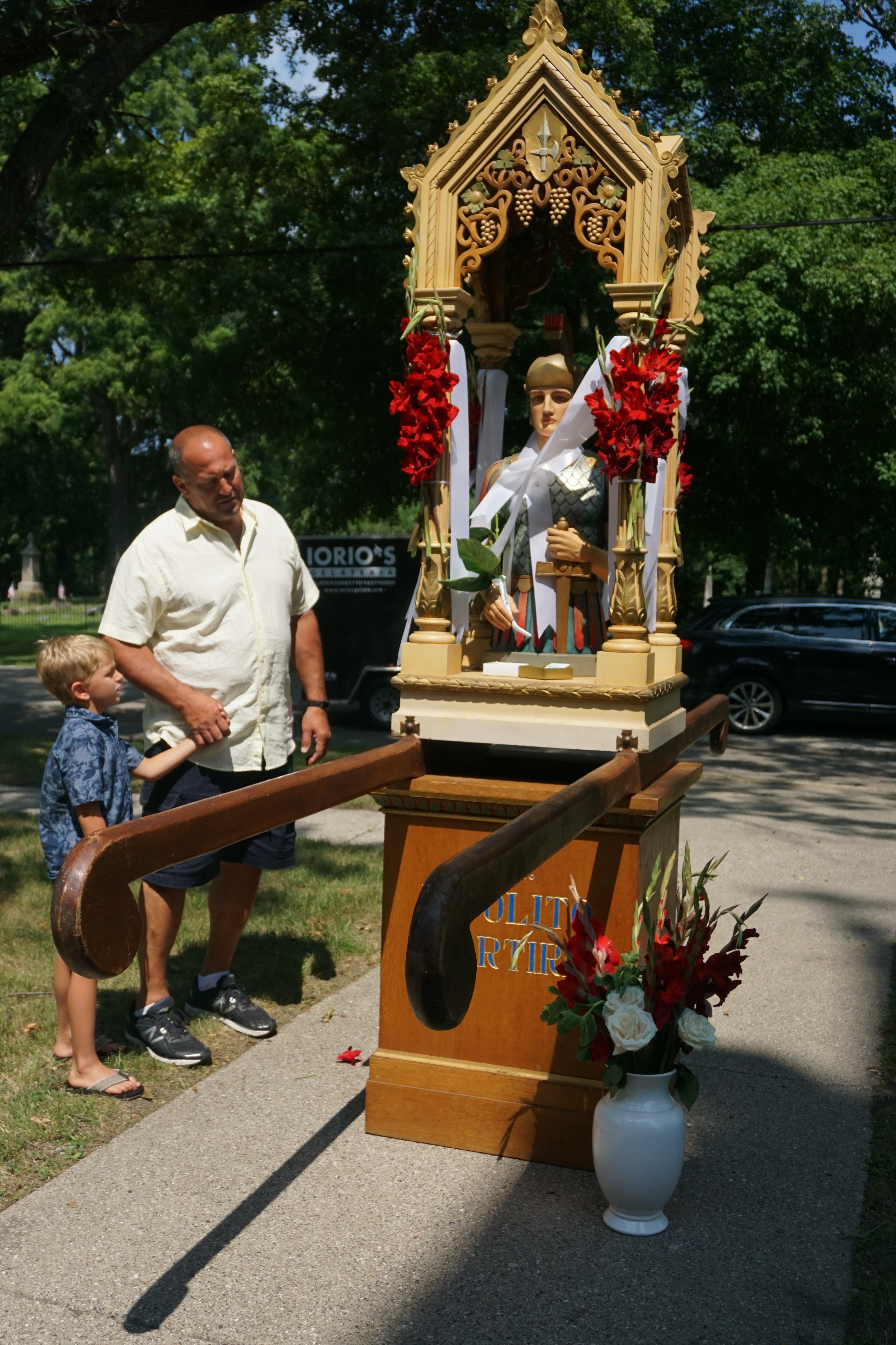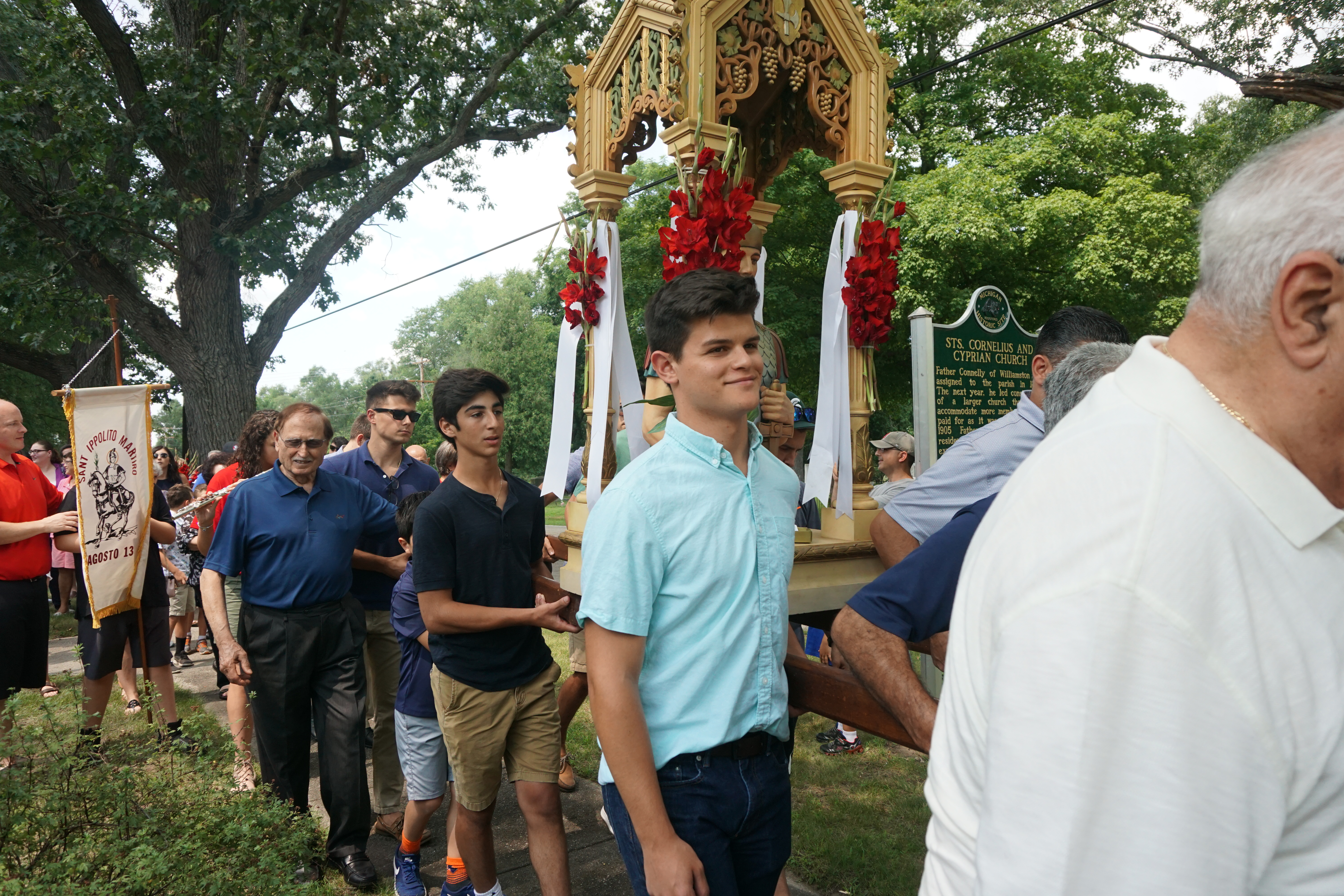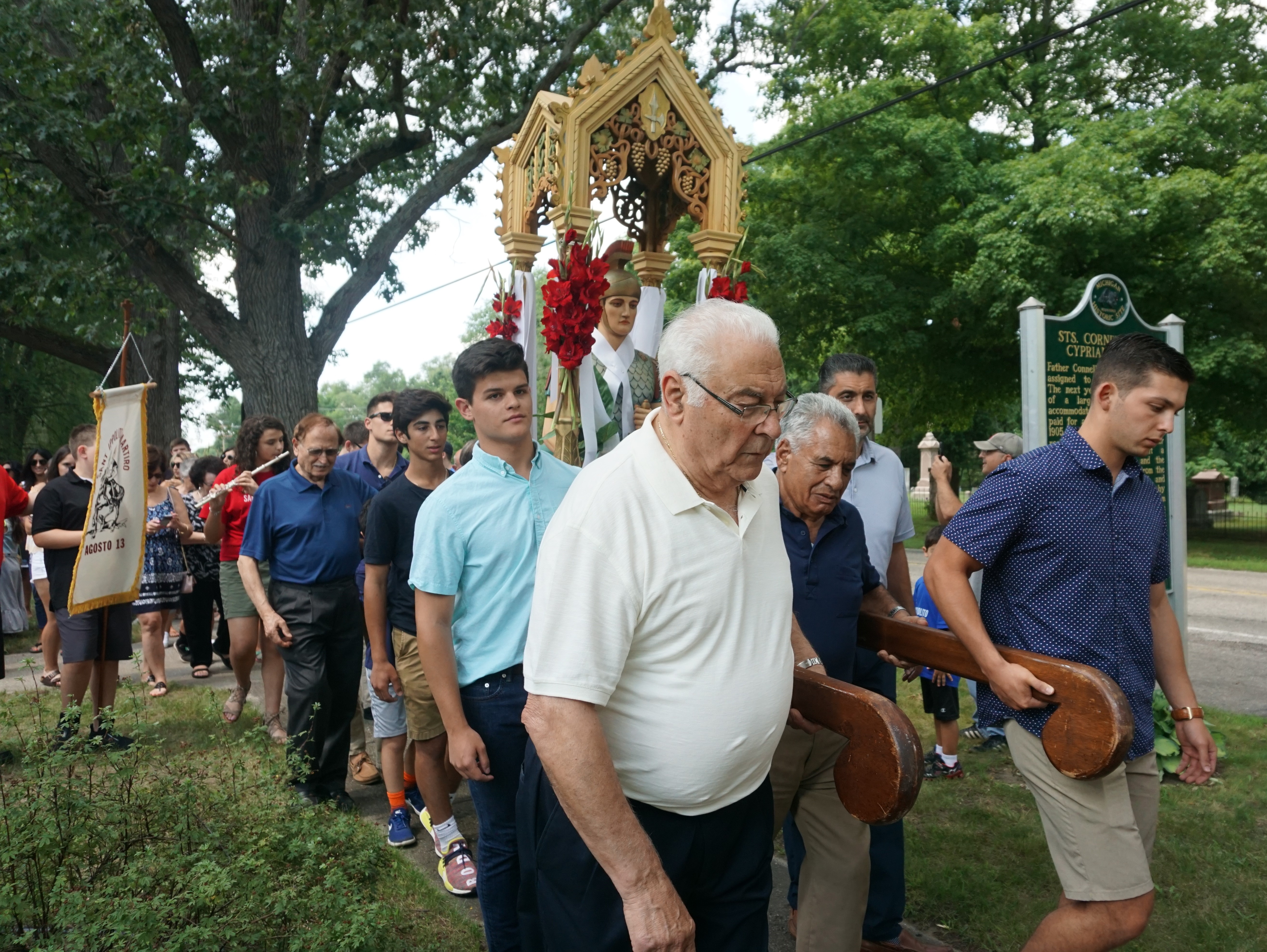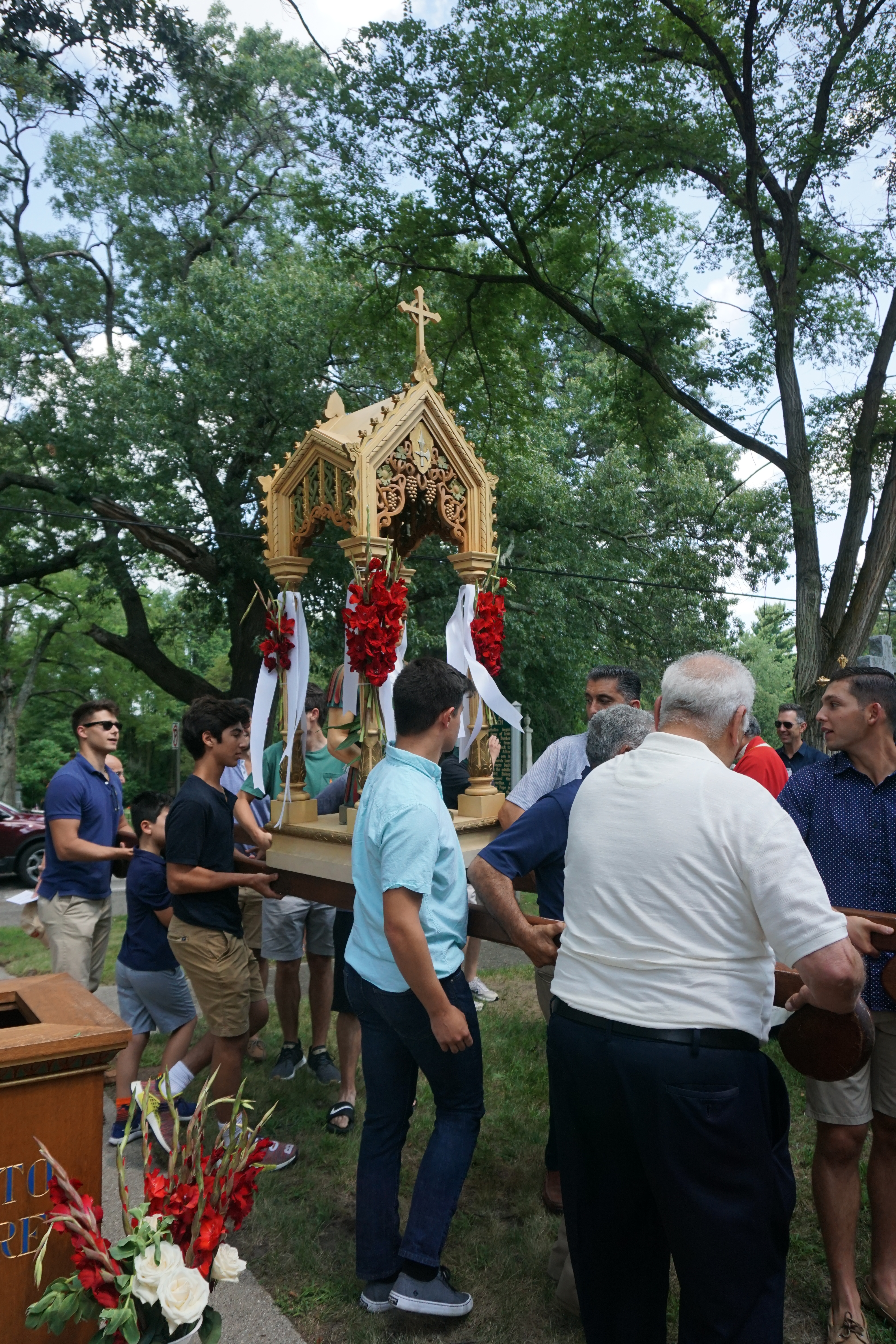 It is tradition for attendees, often grandfathers, fathers, and grandsons, to carry the statue during the Procession.